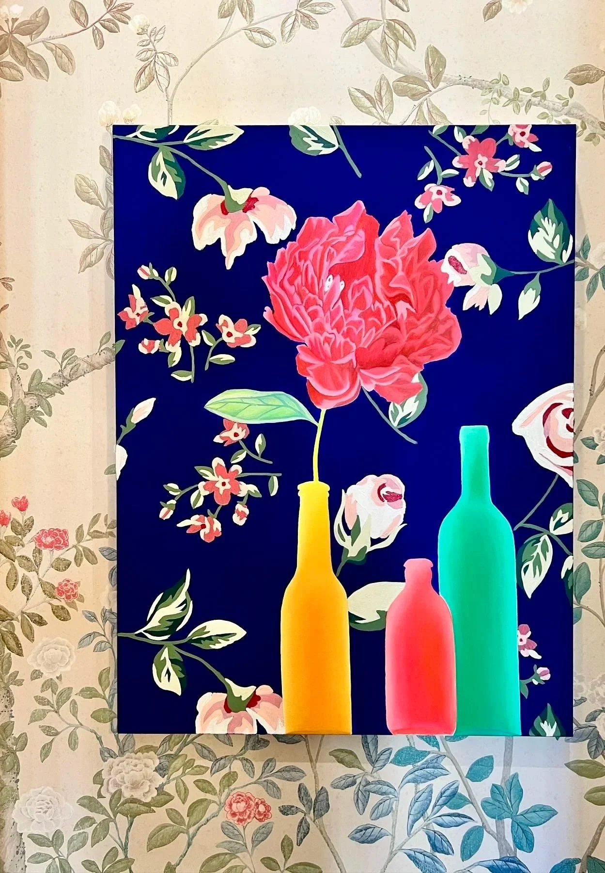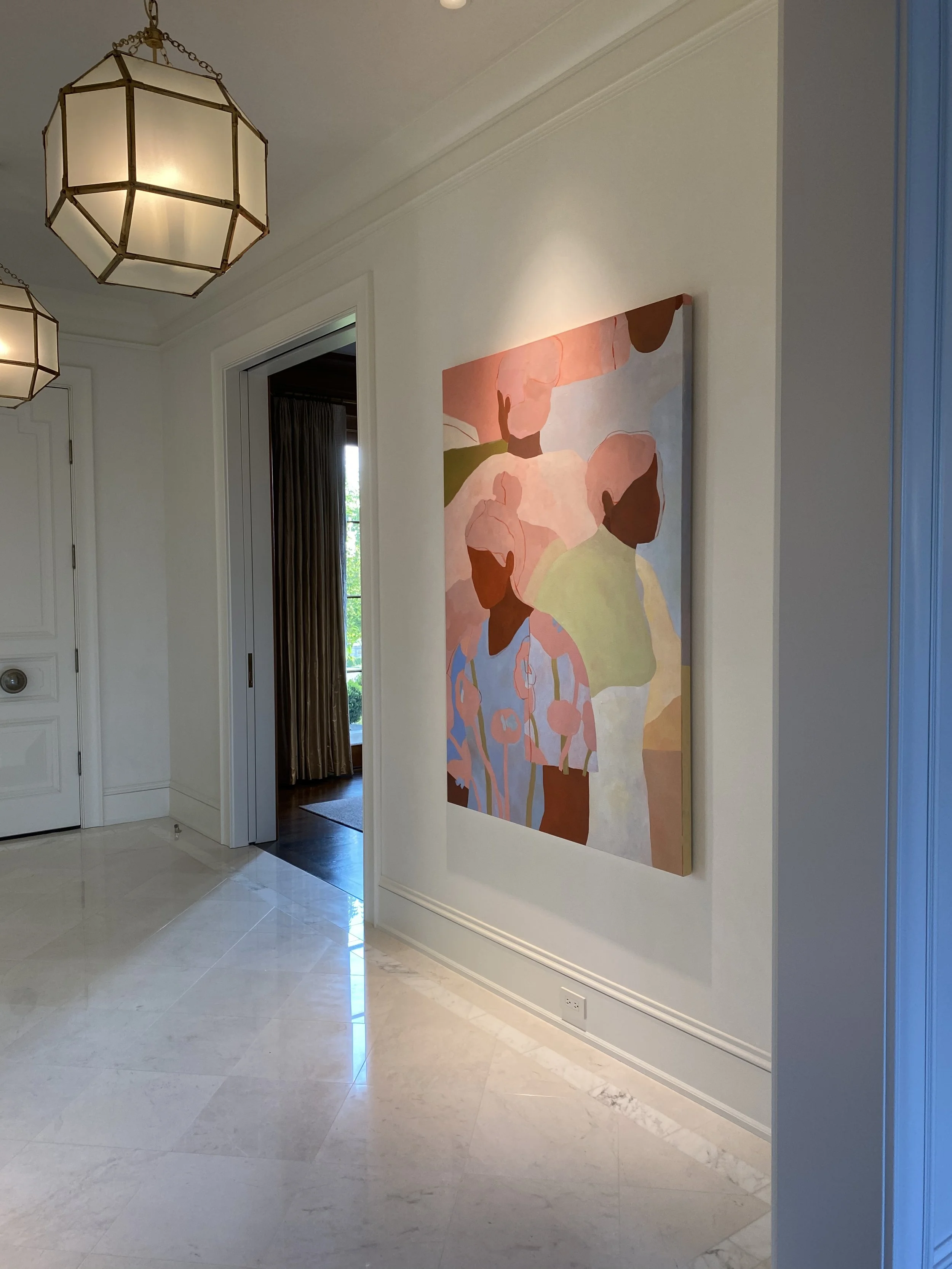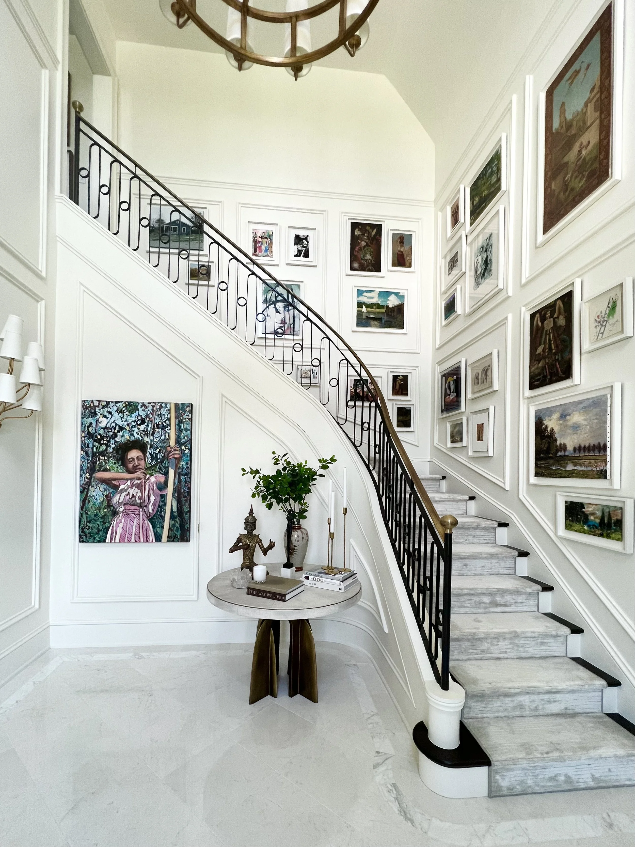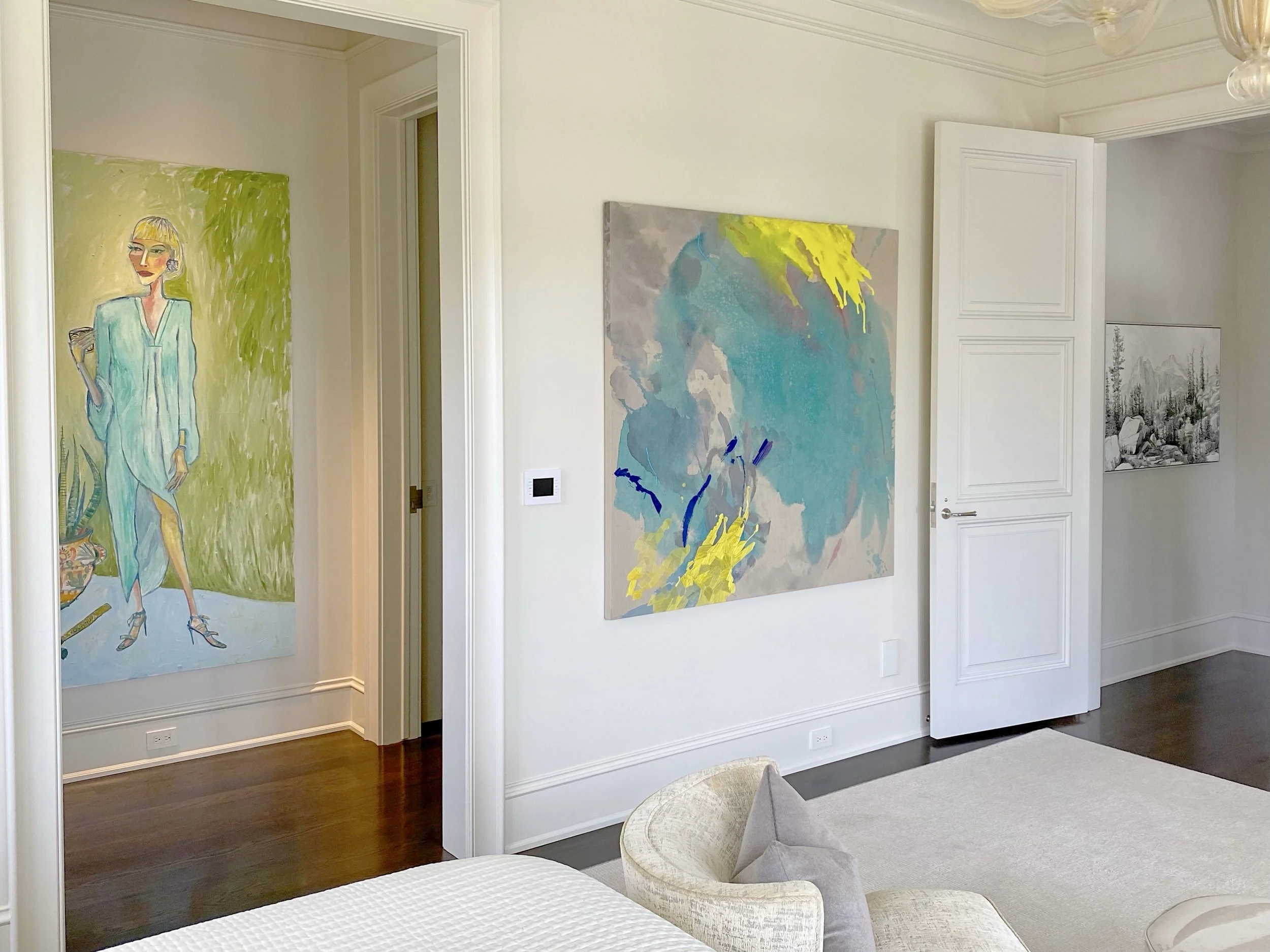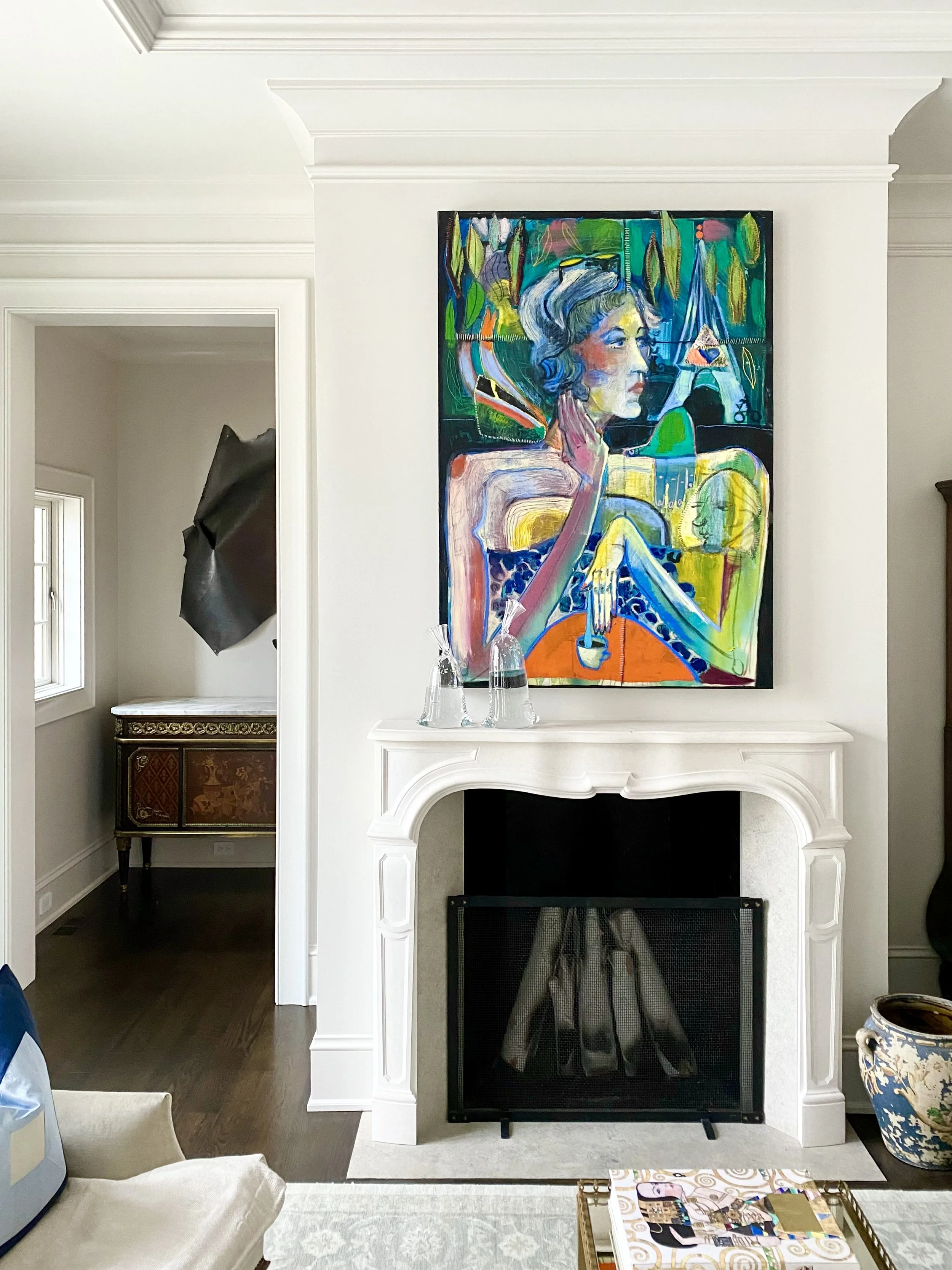 A staircase transformed into a salon-style gallery. Expressive abstracts commanding bedroom walls. A sticking figurative work anchoring the living room above a carved mantel. Nothing was rushed. Everything was considered.