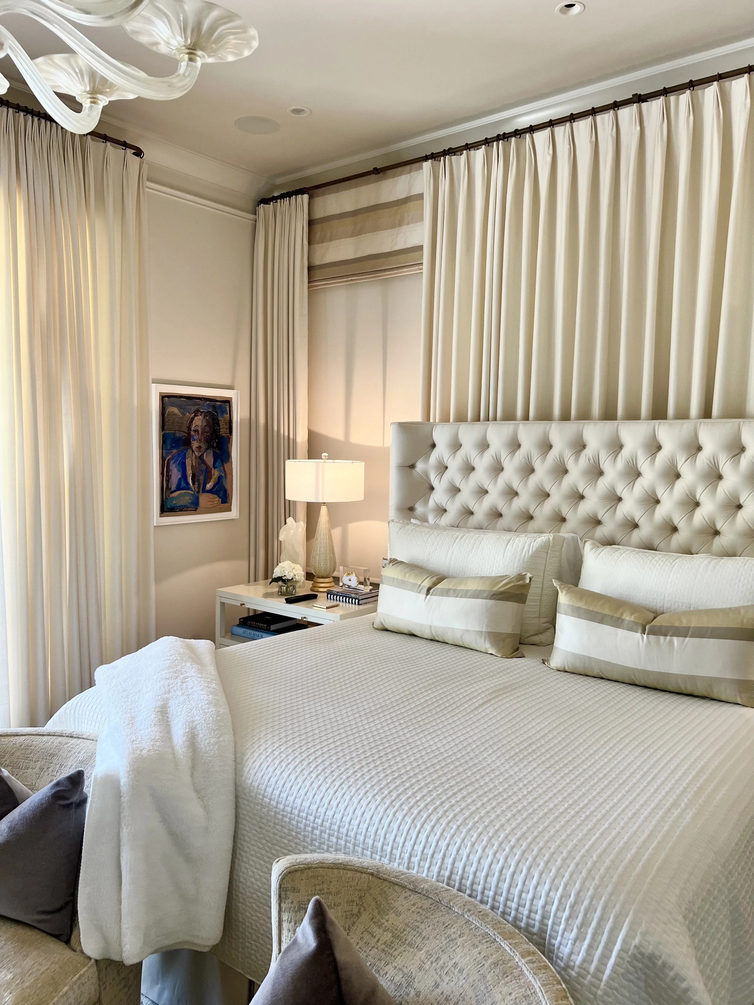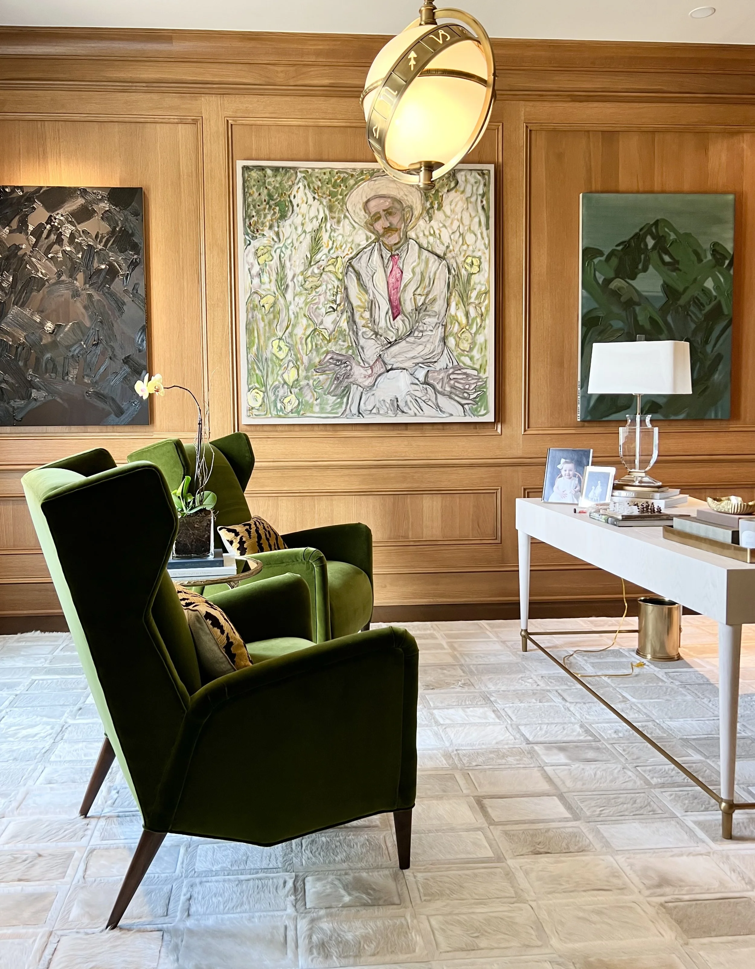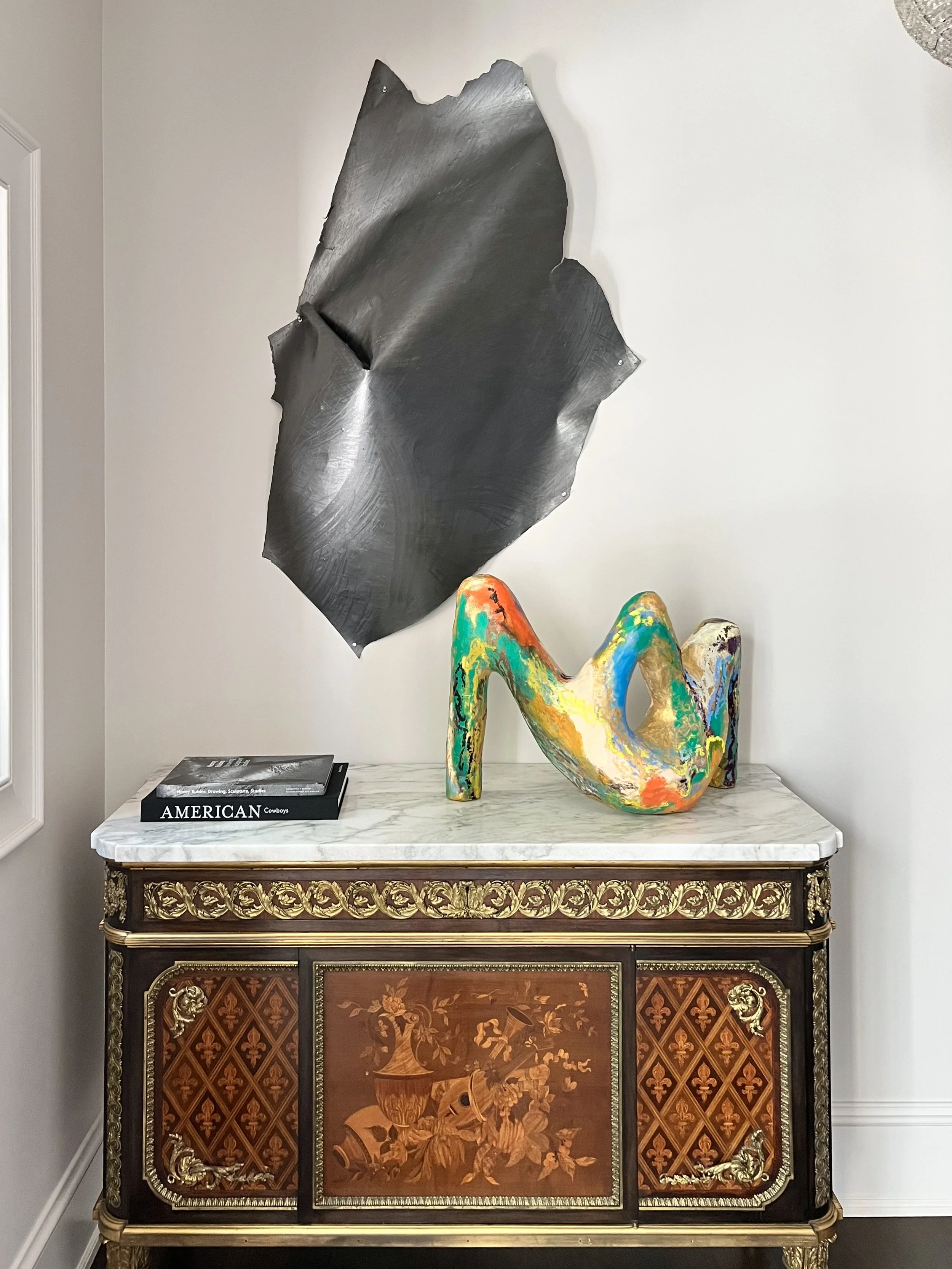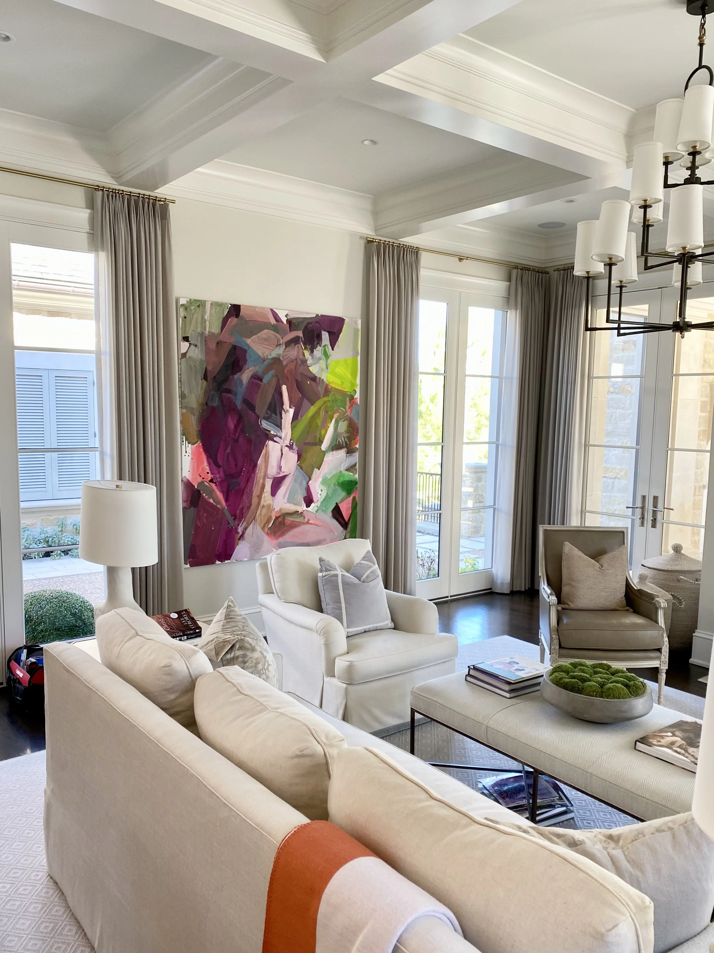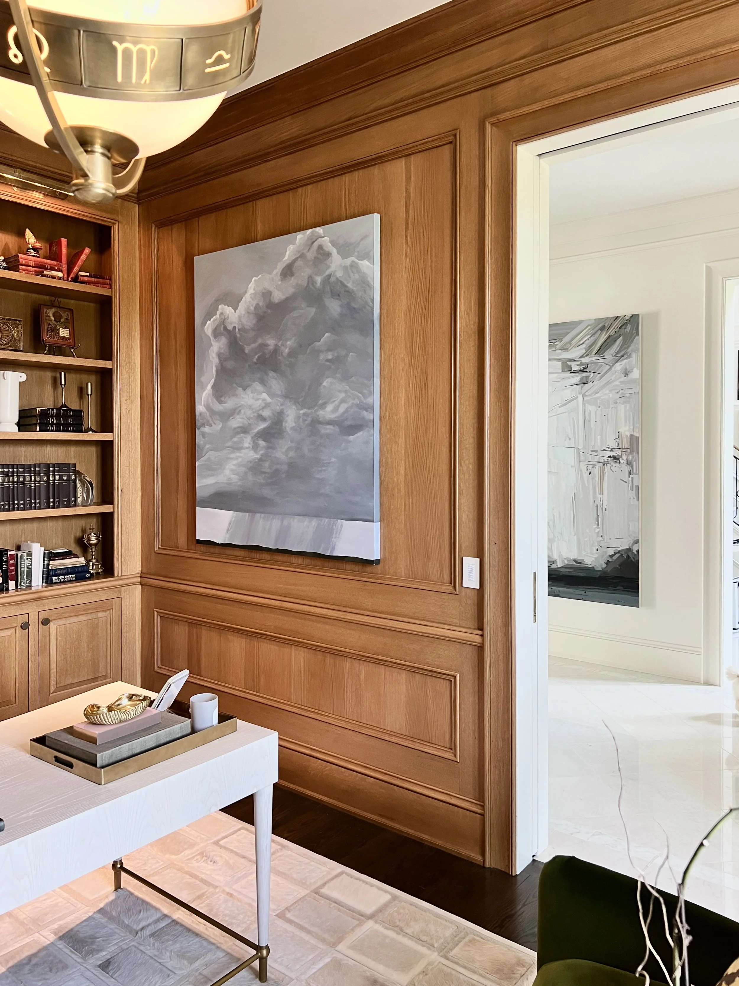 This classically-detailed new build—coffered ceilings, carved limestone mantels, paneled millwork—was always designed to hold something bolder. Working closely with this couple over many years, we acquired, curated, and styled an evolving collection of contemporary works that now live throughout every room with intention and confidence.